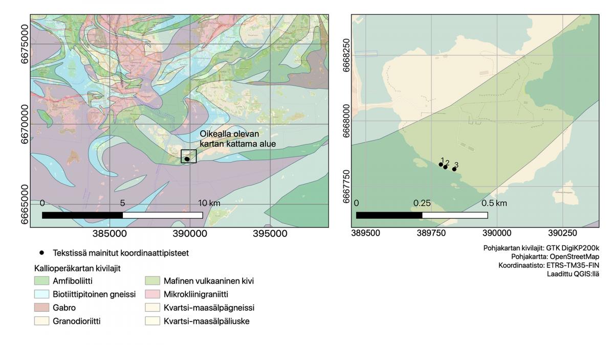 Harmaa granodioriitti ja saaren eteläosan kallioperää hallitsevat vanhemmat metavulkaaniset kivilajit kohtaavat saaren lounaanpuoleisella rannalla. Vulkaaninen kivi on peräisin muinaisen valtameren saarikaaresta, joka on puristunut mantereista kuoren kappaletta vasten. Työntö on sulattanut maankuoren syvempiä osia ja synnyttänyt granodioriittista magmaa, joka on tunkeutunut ylemmäksi kuoreen. Granodioriitissa voi myös havaita hiertopoimutusta, joka on syntynyt kiven ollessa noin 10-20 kilometrin syvyydessä.
