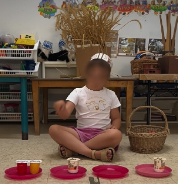The image below is from a video taken during a music lesson in a kindergarten in Israel (Bar Shalom, 2025). The girl “wrote” a rhythm she had composed using milk candy boxes as her notation. By guiding the other children to clap in synchrony with her rhythm—accompanying a traditional holiday song—she transformed her musical creation into a collective experience. This participatory activity strengthens social bonds and fosters engagement with the community’s cultural and religious heritage.