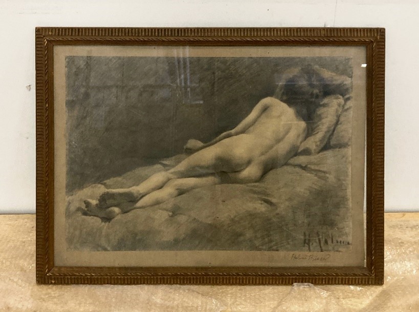 Valitsin ensimmäiseksi nostoksi teokset, jotka kuvaavat hyvin akateemisen taideopetuksen historiaa. Töistä ensimmäinen on Helmi Biesen (1867–1933) nimeämätön hiilipiirros vuoteella makaavasta alastonmallista.