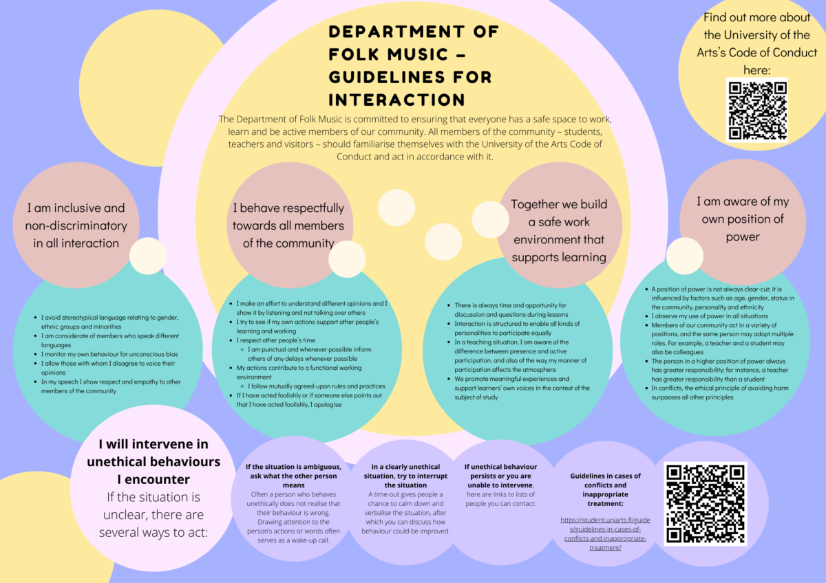 The Folk Music department is committed to reducing the threshold for reporting inappropriate behavior and preventing incidents proactively. We have established shared principles for a safe space, guiding the department’s activities. This publicly accessible code of conduct is reviewed annually in both teacher and student gatherings, fostering regular discussions on aspects that may be challenging to remember or recognise in day-to-day activities.