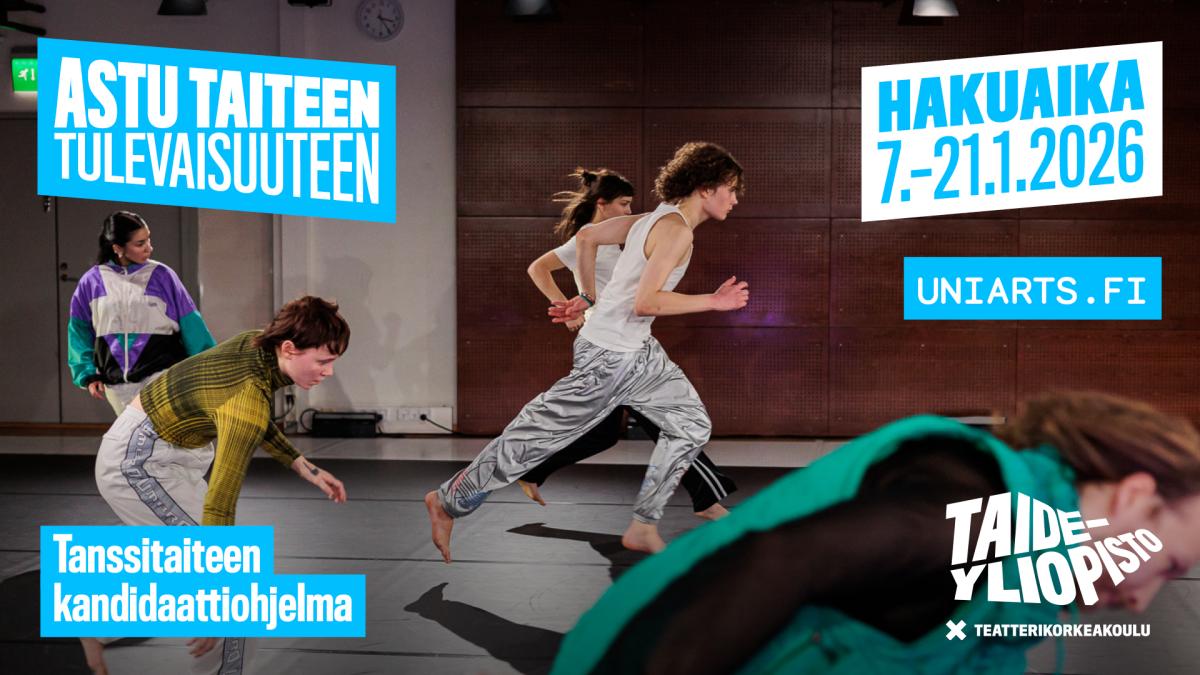 Taideyliopiston Teatterikorkeakoulun tanssitaiteen kandidaattiohjelma hakee opiskelijoita syksyllä 2026 alkavaan koulutukseen.