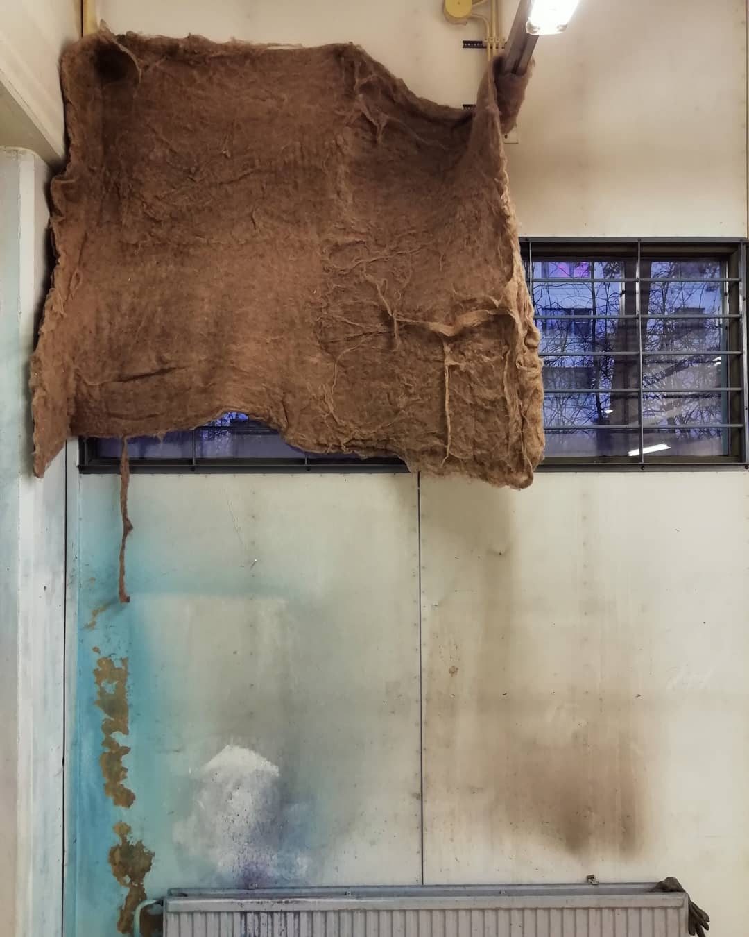 Oma pääasiallinen tekstiilikäsityötekniikkani on villahuovutus, joka on ikivanha tekstiilimateriaalin valmistusmenetelmä, yksi kaikkein vanhimmista. Sen veistoksellisuus ja omatahtoisuus viehättää. Kaiken keskiössä on veden, hallitun voimankäytön ja emäksisen aineen avulla tapahtuva alkeellinen magia, joka saa untuvaisen villan tihentymään, käpymäiset kuidut avautumaan ja sekoittumaan toisiinsa. Prosessi raskauttaa materiaalin ja kutistaa sen ulottuvuksia. Villa ei myöskään aina tottele, se jää tahallaan möykkyiseksi tai jättää välillä huopumatta ja kehittää reikiä. Pidän sen arvaamattomuudesta ja muinaisuudesta. En ole teknisesti lahjakas käsitöiden saralla, enkä pidä juurikaan suunnitelmallisesta yksityiskohtien toteuttamisesta ja hiomisesta. Villa on suurpiirteinen, eikä sen kanssa tarvitse edetä kaavamaisesta. Villahuovutus tarjoaa oman erityisen työskentelytavan ja mahdollistaa ronskimmat otteet. Se pakottaa hyväksymään virheitä ja muuttamaan suunnitelmia useaan kertaan lennosta ja sopii siksi minulle täydellisesti.