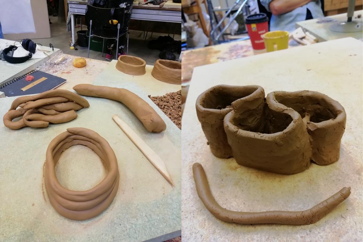 Huikkailen saviklönttini äärestä terveiset yhdelle jos toisellekin tutulle naamalle. Vieressäni purkautuu kokonaisen talon verran ruostutettua peltiä ja Ida Sofia Flemingin lopputyö katoaa silmieni edessä kulkeutuakseen Exhibition Laboratoryyn, tullakseen jälleen pystytetyksi parrasvaloihin. Anna Broms piipahtaa pakkaamassa ja tarkkailen kiinnostuneena hektisen tuntuista logistiikkaa ja tolkuttoman pitkää kuplamuovitettua pakettia aivan työpisteeni tuntumassa. Teresa Kari saapuu jälleen assistentteineen painamaan pitkää päivää, monennettako putkeen? Pistäydyn auliisti pyydettäessä heittämässä mielipiteeni milloin minkäkin reiän tai pinnan olemassaolon mahdollisuuksista ja mahdottomuuksista. Olen omalla keramiikkatyöpisteelläni aivan keskellä tätä kaikkea, siltikin vain tsemppaajana, etätarkkailijana ja (banaani)kärpäsenä katossa.